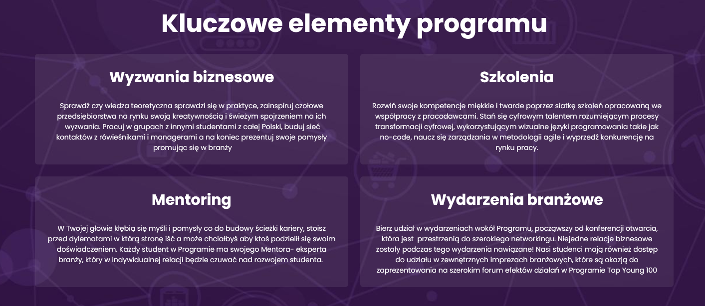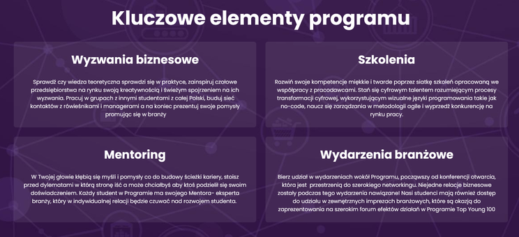Jeśli jesteś studentem inwestującym w swój rozwój, chcesz zmierzyć się z realnymi wyzwaniami biznesowymi czołowych przedsiębiorstw, cechuje Cię aktywność oraz chęć realnego wpływu na swoją ścieżkę kariery to trafiłeś w dobre miejsce. Stań się pożądanym na rynku pracy talentem cyfrowym z Programem Top Young 100.